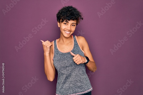Young beautiful african american afro sportswoman doing exercise wearing sportswear Pointing to the back behind with hand and thumbs up, smiling confident