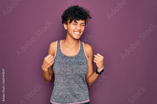 Young beautiful african american afro sportswoman doing exercise wearing sportswear very happy and excited doing winner gesture with arms raised, smiling and screaming for success. Celebration.