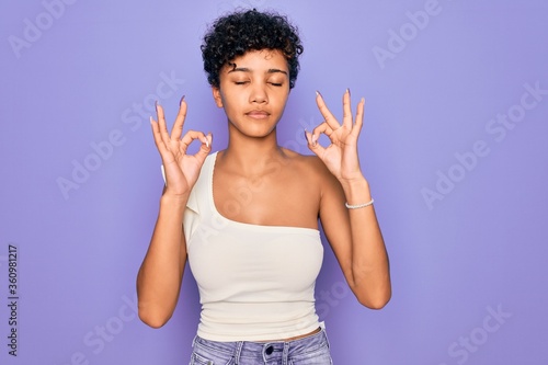 Young beautiful african american afro woman wearing casual t-shirt over purple background relaxed and smiling with eyes closed doing meditation gesture with fingers. Yoga concept.