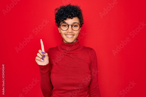 Young beautiful african american afro woman wearing turtleneck sweater and glasses pointing finger up with successful idea. Exited and happy. Number one.