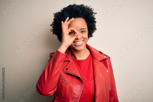 Young beautiful African American afro woman with curly hair wearing casual red jacket doing ok gesture with hand smiling, eye looking through fingers with happy face.