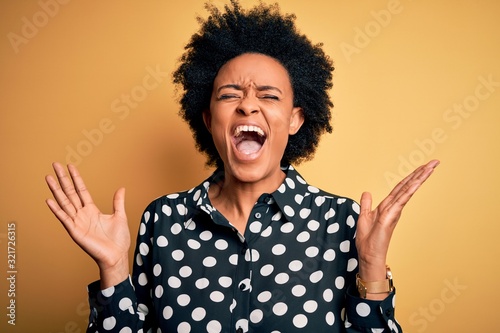 Young beautiful African American afro woman with curly hair wearing casual shirt standing celebrating mad and crazy for success with arms raised and closed eyes screaming excited. Winner concept