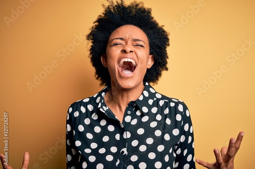 Young beautiful African American afro woman with curly hair wearing casual shirt standing crazy and mad shouting and yelling with aggressive expression and arms raised. Frustration concept.