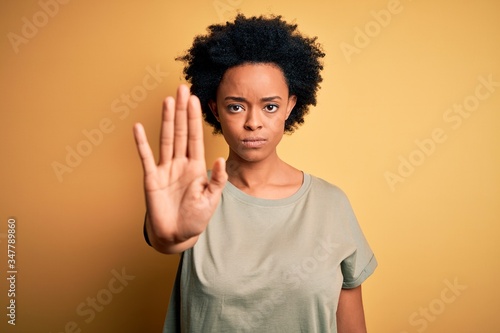 Young beautiful African American afro woman with curly hair wearing casual t-shirt doing stop sing with palm of the hand. Warning expression with negative and serious gesture on the face.