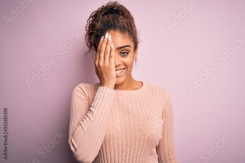 Young beautiful african american girl wearing casual sweater standing over pink background covering one eye with hand, confident smile on face and surprise emotion.