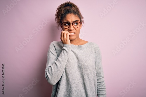 Young beautiful african american girl wearing sweater and glasses over pink background looking stressed and nervous with hands on mouth biting nails. Anxiety problem.