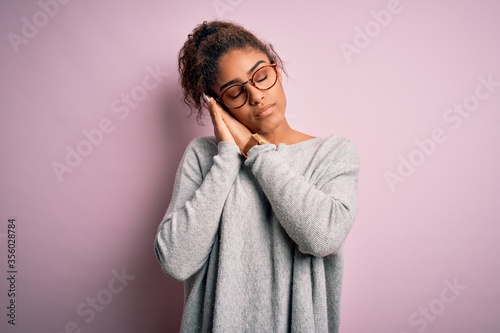 Young beautiful african american girl wearing sweater and glasses over pink background sleeping tired dreaming and posing with hands together while smiling with closed eyes.