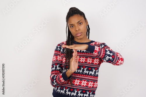Young beautiful African American woman wearing Christmas sweater against white wall feels tired and bored, making a timeout gesture, needs to stop because of work stress, time concept.