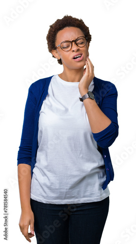 Young beautiful african american woman wearing glasses over isolated background touching mouth with hand with painful expression because of toothache or dental illness on teeth. Dentist concept.