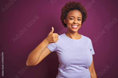 Young beautiful african american woman with afro hair over isolated purple background doing happy thumbs up gesture with hand. Approving expression looking at the camera showing success.
