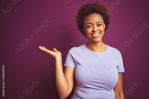 Young beautiful african american woman with afro hair over isolated purple background smiling cheerful presenting and pointing with palm of hand looking at the camera.