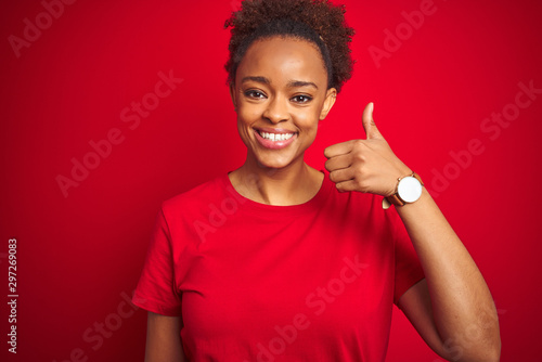 Young beautiful african american woman with afro hair over isolated red background doing happy thumbs up gesture with hand. Approving expression looking at the camera showing success.