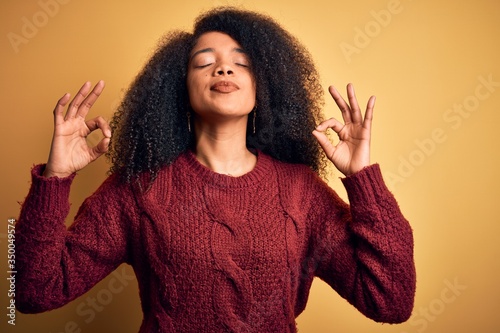 Young beautiful african american woman with afro hair standing over yellow isolated background relax and smiling with eyes closed doing meditation gesture with fingers. Yoga concept.