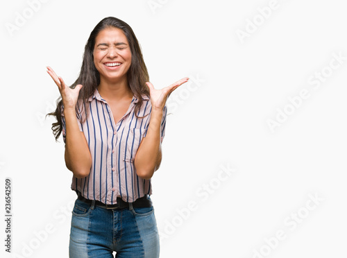 Young beautiful arab woman over isolated background celebrating mad and crazy for success with arms raised and closed eyes screaming excited. Winner concept