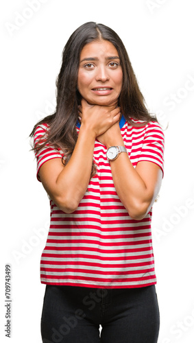Young beautiful arab woman over isolated background shouting and suffocate because painful strangle. Health problem. Asphyxiate and suicide concept.