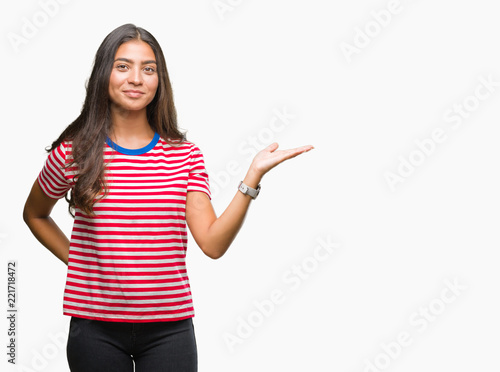 Young beautiful arab woman over isolated background smiling cheerful presenting and pointing with palm of hand looking at the camera.