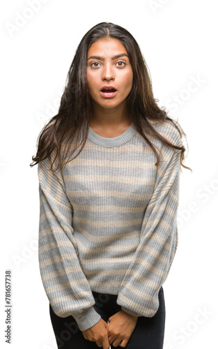 Young beautiful arab woman wearing winter sweater over isolated background afraid and shocked with surprise expression, fear and excited face.