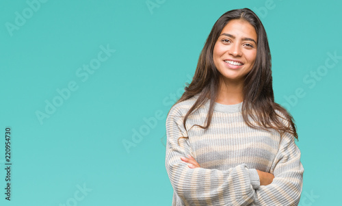Young beautiful arab woman wearing winter sweater over isolated background happy face smiling with crossed arms looking at the camera. Positive person.