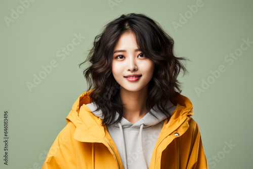Young beautiful Asian girl floating in mid-air pointing finger to copy space with a happy smile
