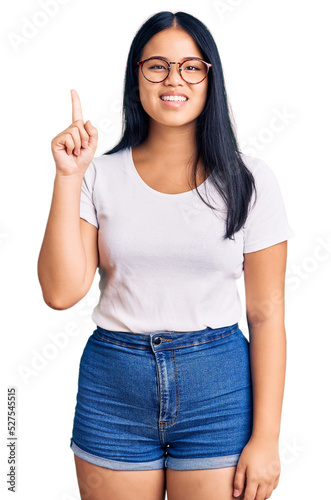 Young beautiful asian girl wearing casual clothes and glasses pointing finger up with successful idea. exited and happy. number one.
