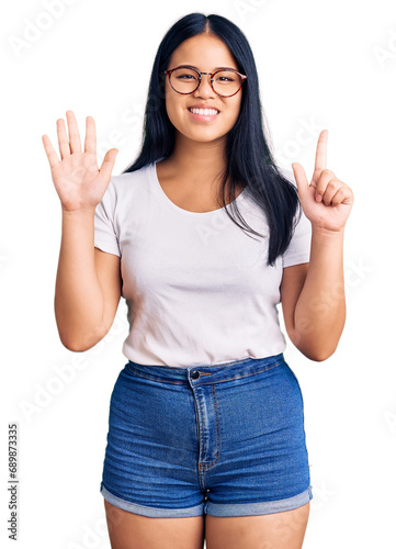Young beautiful asian girl wearing casual clothes and glasses showing and pointing up with fingers number seven while smiling confident and happy.