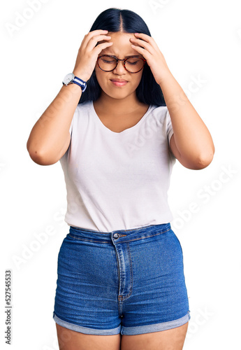 Young beautiful asian girl wearing casual clothes and glasses suffering from headache desperate and stressed because pain and migraine. hands on head.