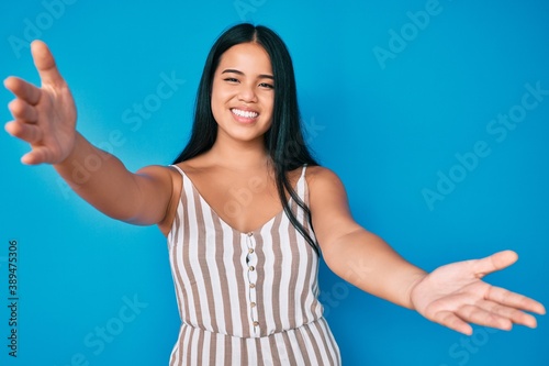 Young beautiful asian girl wearing casual clothes looking at the camera smiling with open arms for hug. cheerful expression embracing happiness.