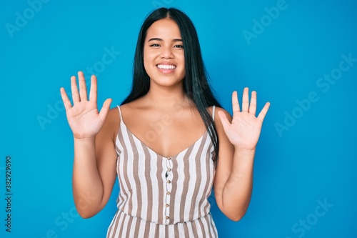 Young beautiful asian girl wearing casual clothes showing and pointing up with fingers number ten while smiling confident and happy.