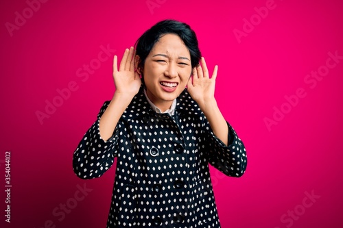 Young beautiful asian girl wearing casual jacket standing over isolated pink background Trying to hear both hands on ear gesture, curious for gossip. Hearing problem, deaf