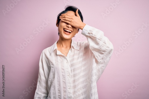 Young beautiful asian girl wearing casual shirt standing over isolated pink background smiling and laughing with hand on face covering eyes for surprise. Blind concept.
