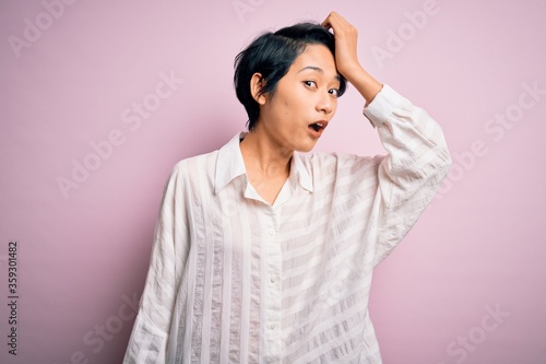Young beautiful asian girl wearing casual shirt standing over isolated pink background surprised with hand on head for mistake, remember error. Forgot, bad memory concept.