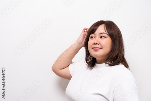 Young beautiful Asian oversize women smile with positive emotion, feeling happy and proud with her body size. Portrait shot on white background with copy space.