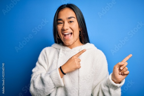 Young beautiful asian sportswoman wearing sweatshirt standing over isolated blue background smiling and looking at the camera pointing with two hands and fingers to the side.