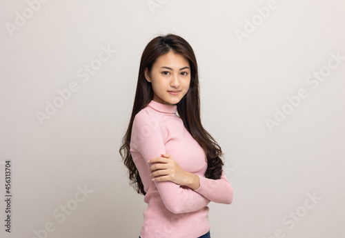Young beautiful asian teenager girl in pink shirt standing and smile on isolated white background.