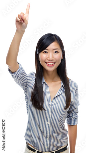 Young beautiful asian woman pointing upward, isolated on white background. Generative AI.