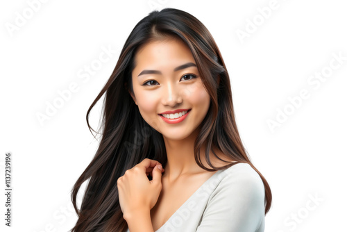 Young beautiful Asian woman smiling with long brunette hair, beauty concept, isolated on transparent background