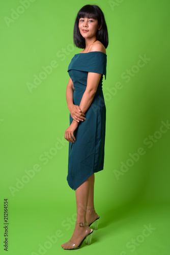 Young beautiful Asian woman wearing blue off-shoulder dress