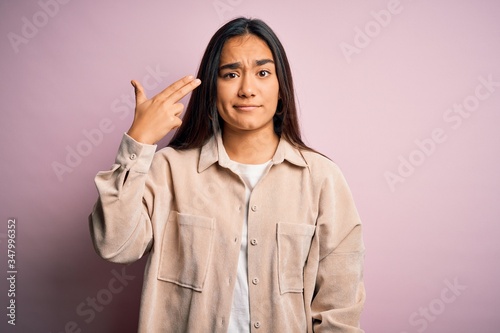 Young beautiful asian woman wearing casual shirt standing over pink background Shooting and killing oneself pointing hand and fingers to head like gun, suicide gesture.