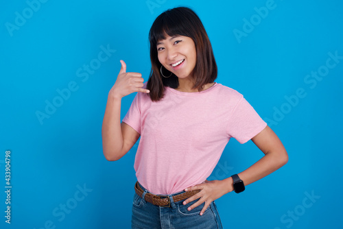 young beautiful asian woman wearing pink t-shirt against blue wall imitates telephone conversation, makes phone call gesture with hands, has confident expression. Call me!