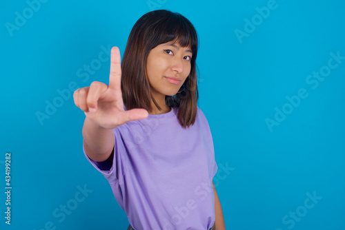 young beautiful asian woman wearing purple t-shirt against blue wall making fun of people with fingers on forehead doing loser gesture mocking and insulting.