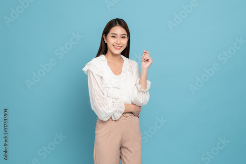 Young beautiful asian woman with smart casual cloth smiling isolated on blue background