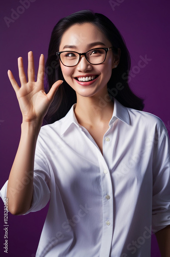 Young beautiful asian women wearing casual shirt and glasses standing over purple background amazed and smiling to the camera while presenting with hand