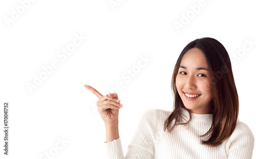 Young beautiful attractive asian woman thinking and pointing isolated on white,smile beautiful and positive thinking woman concept