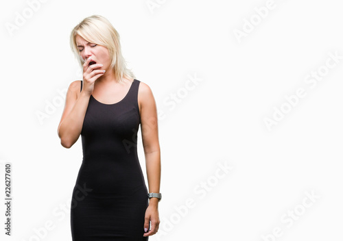 Young beautiful blonde attractive woman wearing elegant dress over isolated background bored yawning tired covering mouth with hand. Restless and sleepiness.