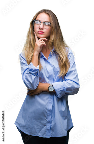 Young beautiful blonde business woman wearing glasses over isolated background with hand on chin thinking about question, pensive expression. Smiling with thoughtful face. Doubt concept.