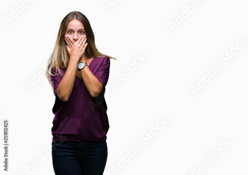 Young beautiful blonde elegant woman over isolated background shocked covering mouth with hands for mistake. Secret concept.