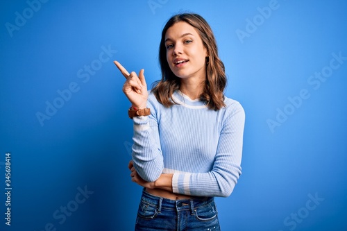 Young beautiful blonde girl wearing casual sweater standing over blue isolated background with a big smile on face, pointing with hand and finger to the side looking at the camera.