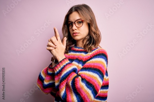 Young beautiful blonde girl wearing glasses and casual sweater over pink isolated background Holding symbolic gun with hand gesture, playing killing shooting weapons, angry face