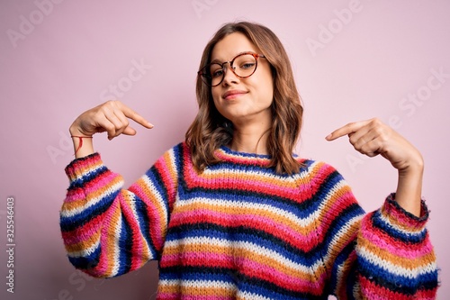 Young beautiful blonde girl wearing glasses and casual sweater over pink isolated background looking confident with smile on face, pointing oneself with fingers proud and happy.