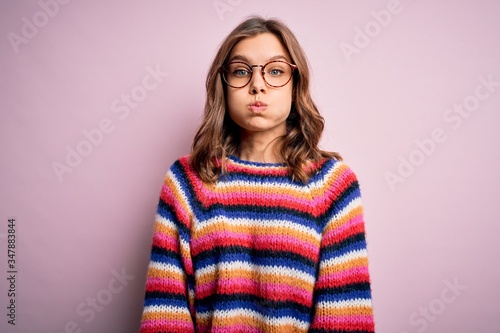 Young beautiful blonde girl wearing glasses and casual sweater over pink isolated background puffing cheeks with funny face. Mouth inflated with air, crazy expression.